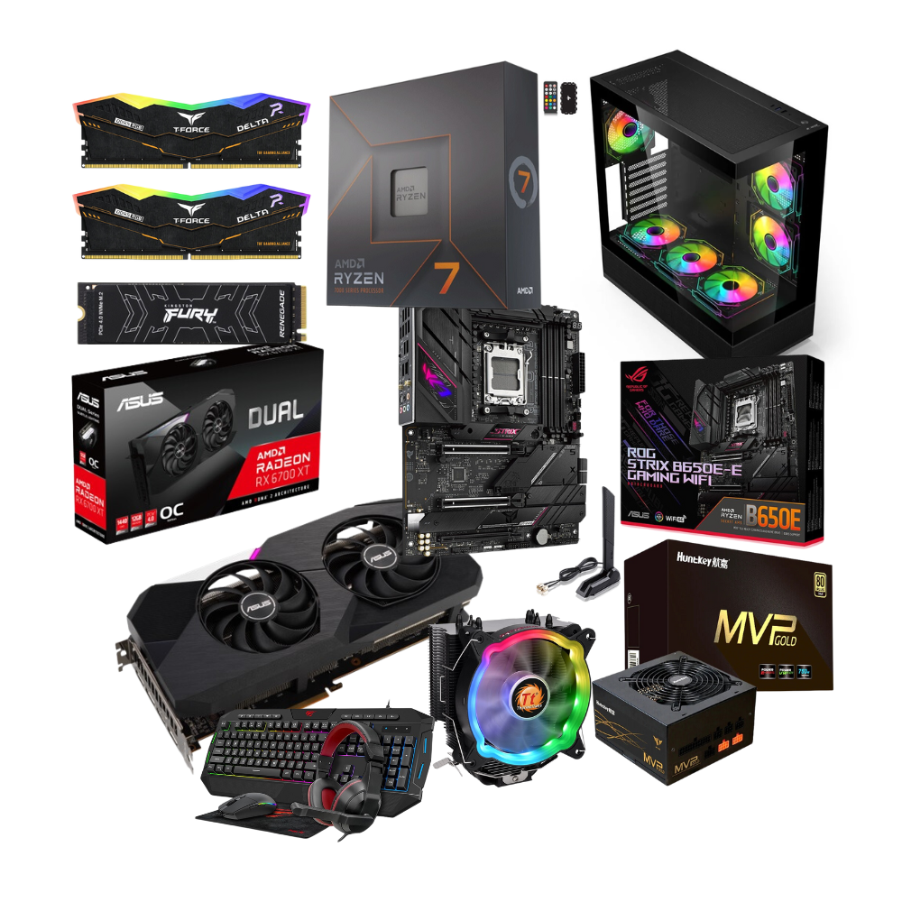 جهاز كمبيوتر ألفا للألعاب 4684 معالج AMD Ryzen 7 7700X Kingston 1TB FURY Renegade 7300MB/s Acer V930B Mid Tower PC Case (6-Fans) ASUS Rog Sstrix B650E-E Gaming WiFi Motherboard T-Force 32GB 6000MHz DDR5 Delta RGB TUF Gaming ASUS 12GB Dual Radeon RX 6700 XT OC Edition VGA Havit KB501CM GameNote 4NI1 Gaming Combo USB WiFi 5G / Win10Pro أو Win11Pro