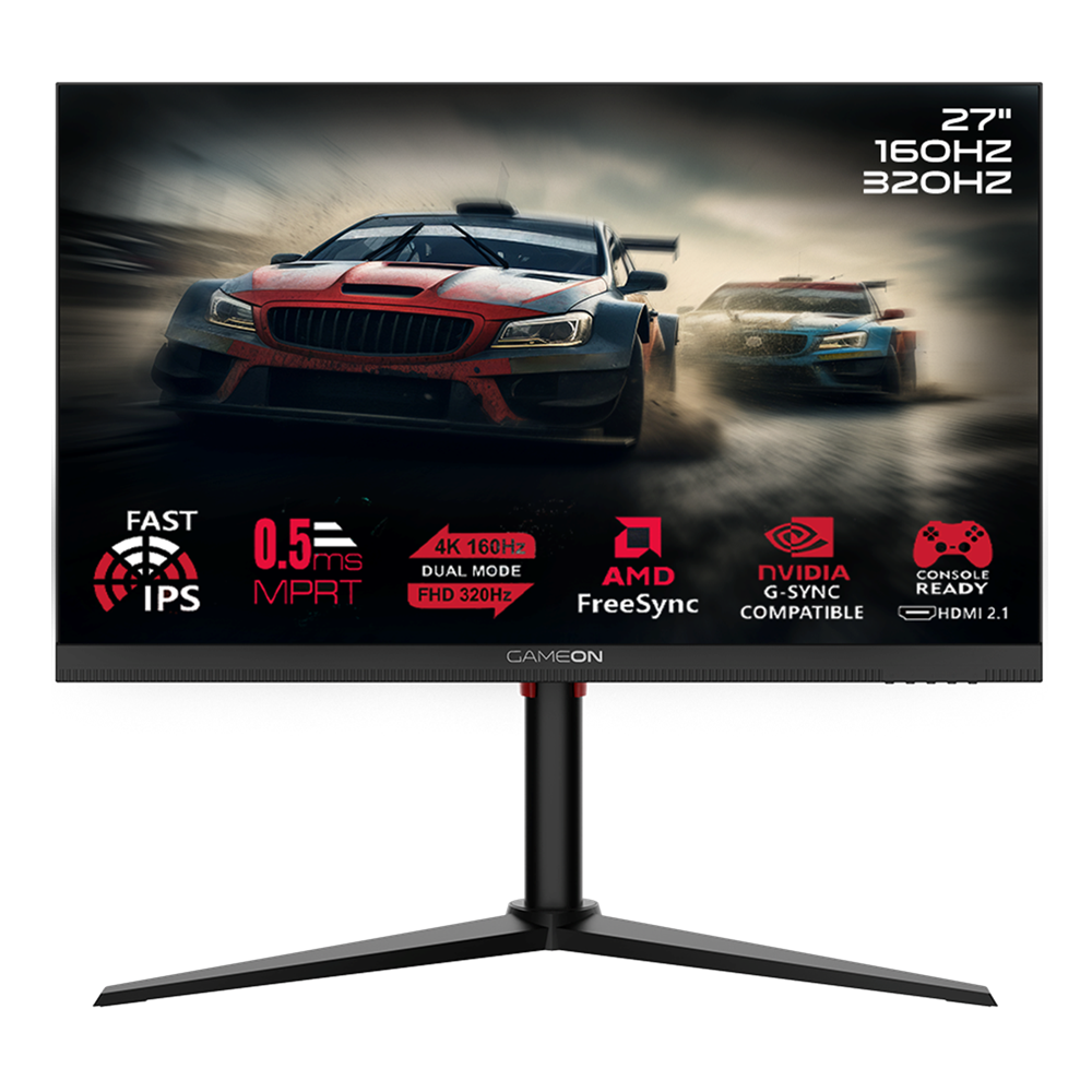 - شاشة ألعاب GAMEON مقاس 27 بوصة – سلسلة Switch X – وضع مزدوج 4K UHD 160Hz / FHD 320Hz، زمن استجابة 0.5 ملثانية، لوحة Fast IPS، HDMI 2.1، سماعة مدمجة، اللون أسود.