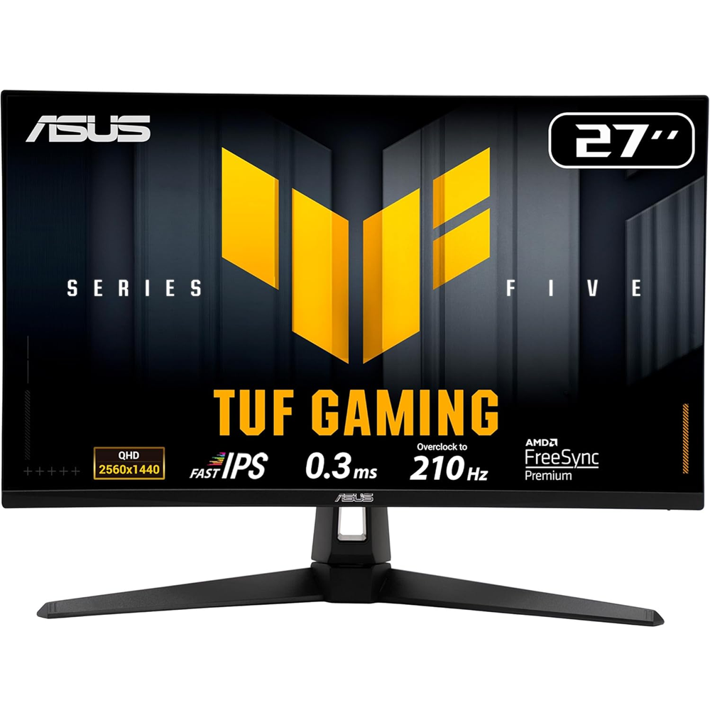 - شاشة ASUS مقاس 27 بوصة سلسلة TUF Gaming 5 – الموديل VG27AQ5A، بمعدل تحديث يصل إلى 210Hz (OC)، وزمن استجابة 0.3ms، لوحة Fast IPS بدقة 2K، مزودة بسماعات، شاشة مخصصة للألعاب