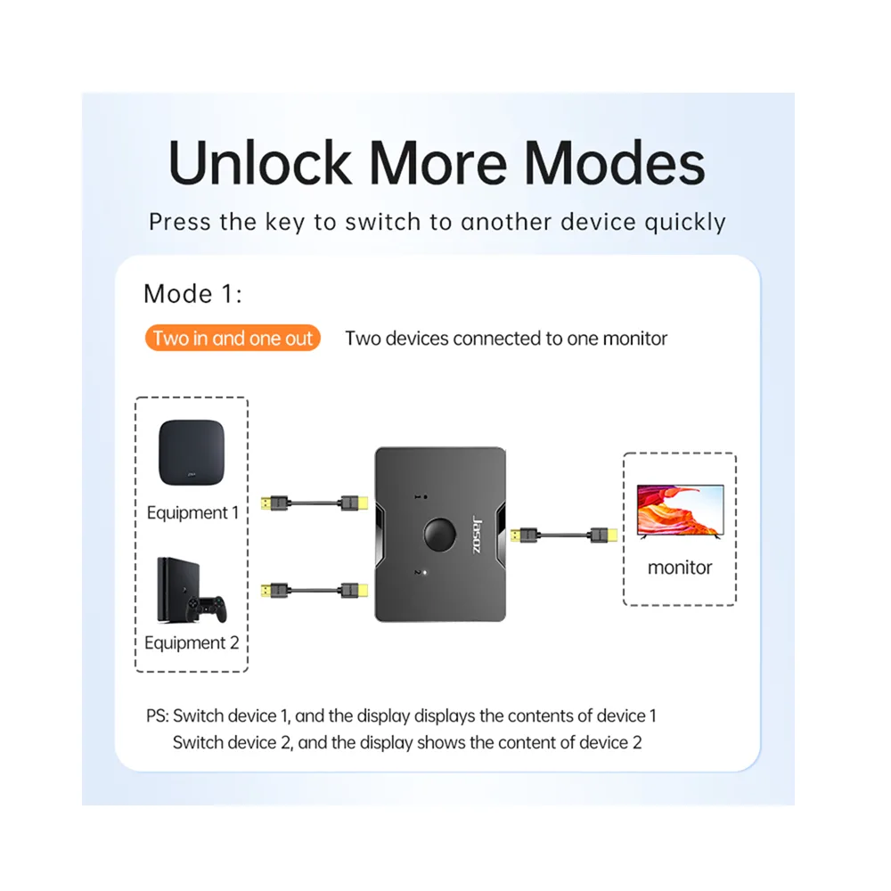 - محول HDMI ثنائي الاتجاه Jasoz G128 بمنفذين بدقة 4K@60Hz (2 مدخل إلى مخرج واحد / 1 مدخل إلى مخرجين)