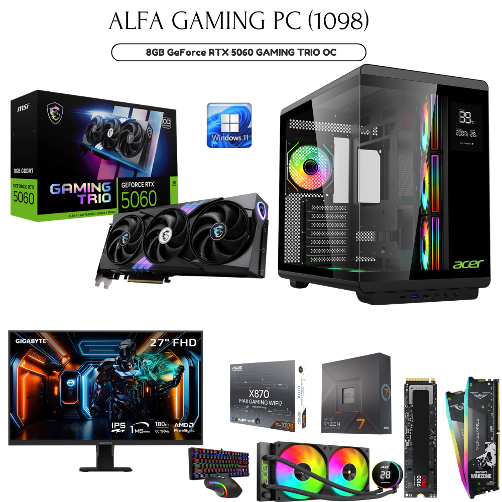 - Alfa Gaming PC 1098 AMD 7700X, 8GB RTX5060, 32GB RAM, 1TB SSD, Gigabyte 27″ 180Hz, Acer U600B, W11Pro, Bundle Combo