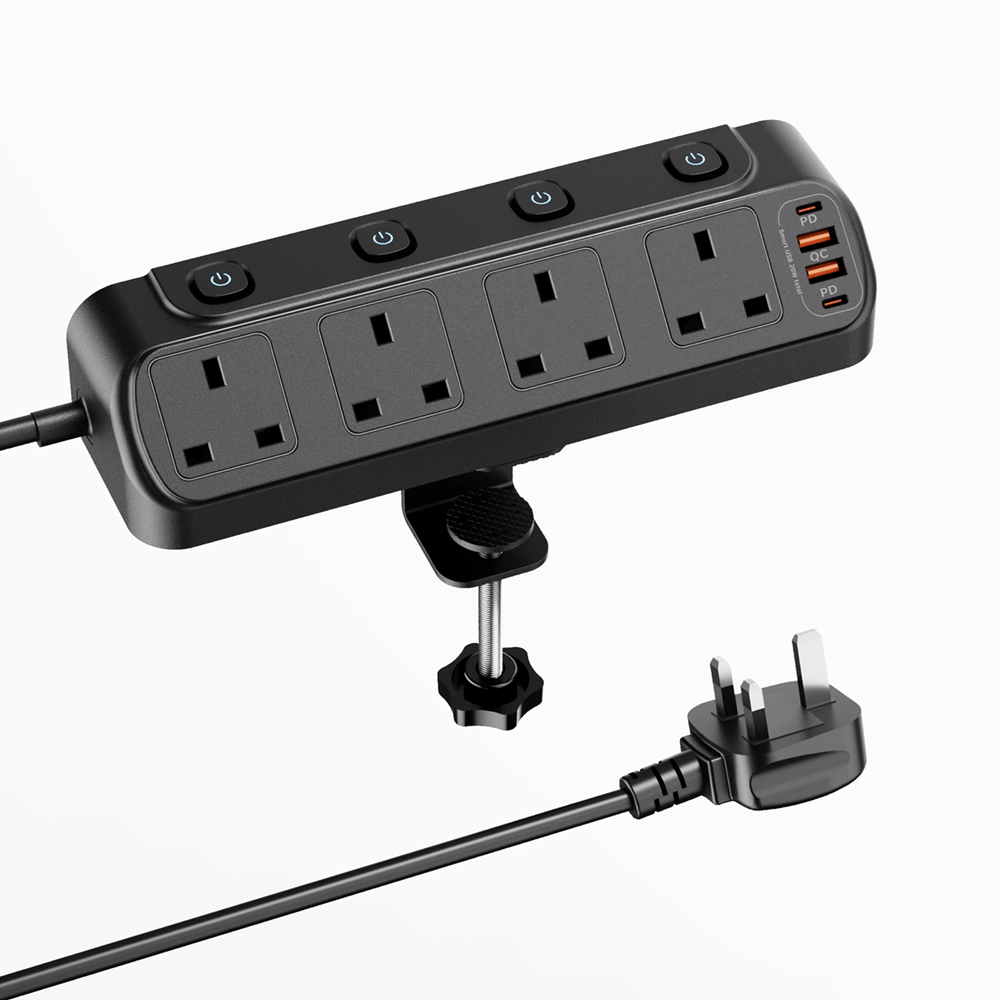 • Clamp-mounted Extension Socket: Desktop extension block comes with durable clamp and 1.8m cable, can be securely installed on the desktop surface using edge mounting brackets. It can be clamped to the back of a desk or wall corner for semi-permanent installation, preventing it from being knocked back into a pile of cables.