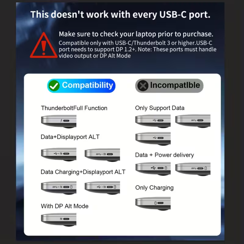• 【Plug and Play】USB-C to Display Port Splitter is plug-and-play, no driver needed. Ensure your laptop/PC has a full function Thunderbolt port or a USB 3.0+ port supporting DP Alt mode. The laptop/graphics card should be USB 3.1 Gen2+, Thunderbolt 3 preferred. The USB-C Multi-Monitor Adapter: Use 1 port for 4K 60Hz, and 2 for 1080P. For all 3 ports to reach 4K 60Hz, you need an NVIDIA RTX 2060 or better, or an AMD RX 6600 XT or better