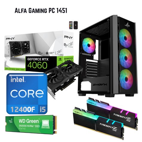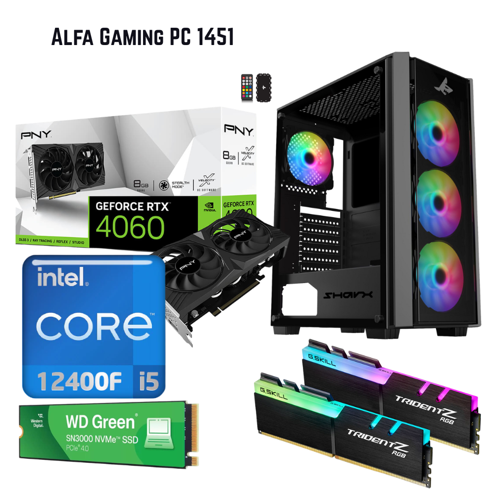 Alfa Gaming PC 1451 Intel Core i5-12400F 12th Gen Processor GSKILL 16GB DDR4 3600MHz RAM Trident Z RGB WD Green 500GB SN3000 M.2 NVMe SSD PCIe Gen4 PNY 8GB GeForce RTX 4060 VERTO Dual Fan VGA Graphic Card